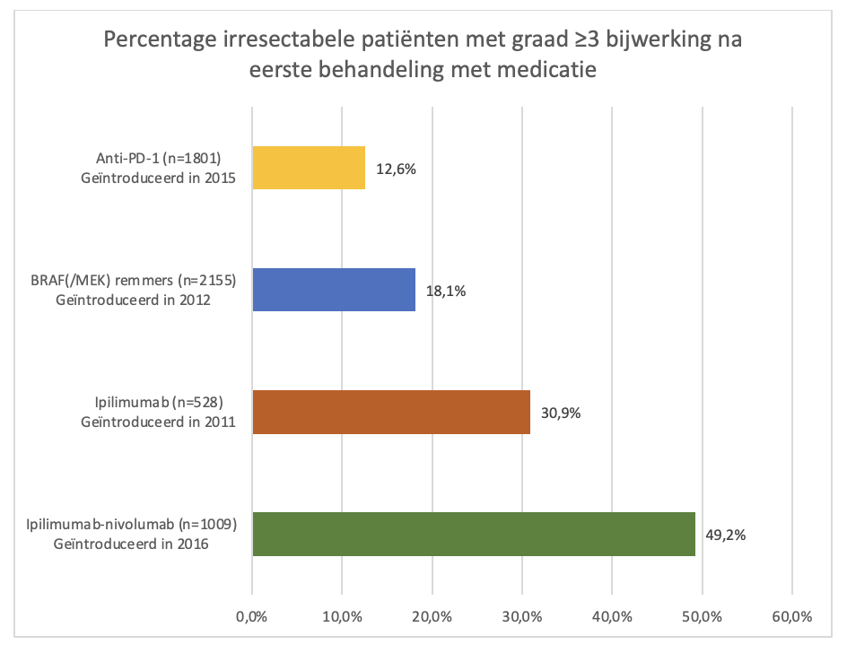 Bij stadium III zijn er uitzaaiingen naar de lymfeklieren, of zijn er uitzaaiingen op de huid rondom de oorspronkelijke tumor, of zijn er uitzaaiingen in of onder de huid tussen de oorspronkelijke tumor en de nabijgelegen lymfeklieren. Bij stadium IV is de tumor is uitgezaaid voorbij de nabijgelegen lymfeklieren naar een deel of delen van de huid of naar andere lymfeklieren, of naar andere organen zoals de lever, longen of de hersenen. Deze staafdiagram betreft het aantal patiënten met een irresectabel stadium melanoom. Dit zijn stadium III en IV patiënten waarbij niet alle uitzaaiingen/ziektelocaties met een operatie verwijderd kunnen worden. In de grafiek is het percentage patiënten te zien dat een graad 3 of hogere bijwerking heeft ervaren ten gevolge van hun behandeling. Elk middel heeft zijn eigen kleur en tussen haakjes staat het aantal mensen dat in de berekening is meegenomen per middel. Bijwerkingen worden ingedeeld in 5 graderingen:
